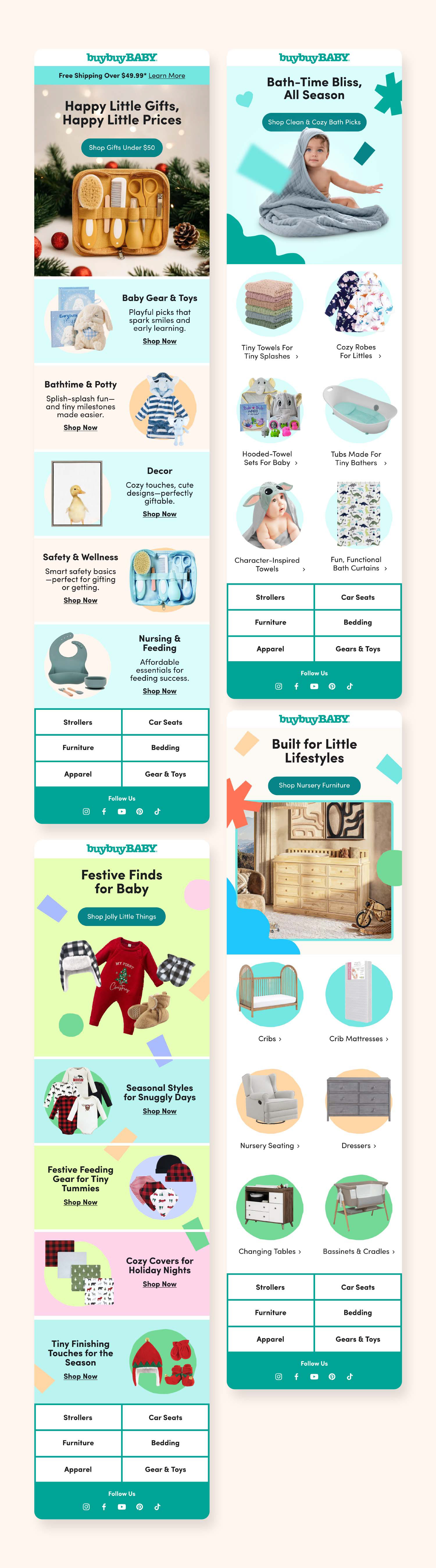 I designed and built a full suite of responsive email campaigns for BuyBuyBABY, leading art direction from concept to final delivery. Working directly with marketing, product, and merchandising stakeholders, I translated business goals into visually compelling, on-brand emails that improved consistency, production efficiency, and customer engagement across seasonal promotions, transactional messages, and lifecycle campaigns.
